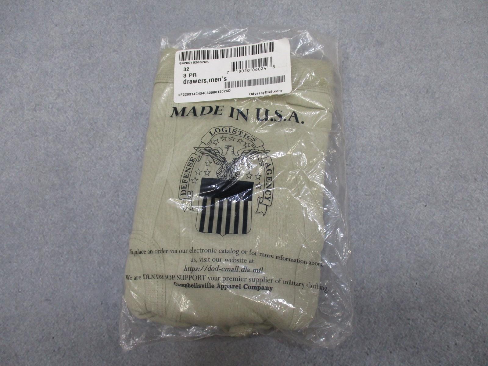 This listing is for a new, sealed package containing 3 pairs of men's drawers (underwear) from the Defense Logistics Agency, manufactured by Campbellville Apparel Company. These are made in the USA and are size 32.
