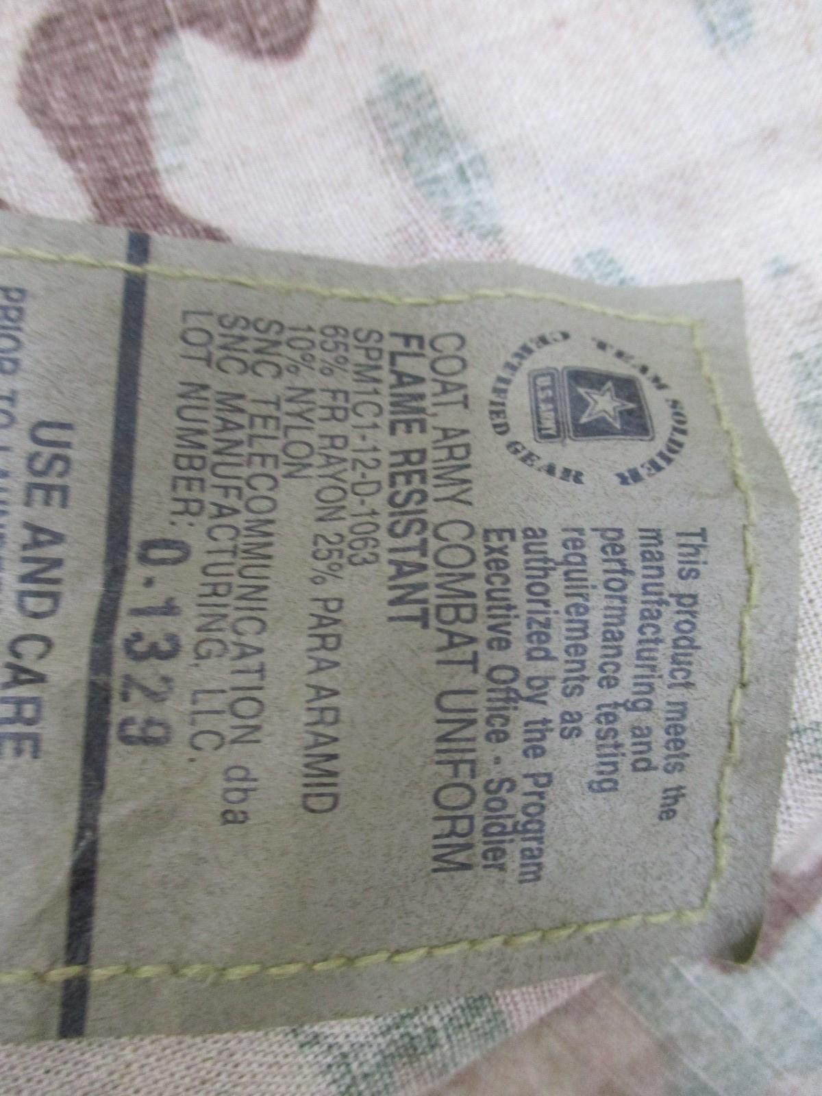 This is a used Army Combat Uniform (ACU) jacket featuring a flame-resistant design and the iconic MultiCam camouflage pattern. It is a size Large-Long, suitable for individuals with a height of 71-75 inches and a chest size of 41-45 inches. The jacket is made by SNC Manufacturing, LLC, and meets the requirements for military use.