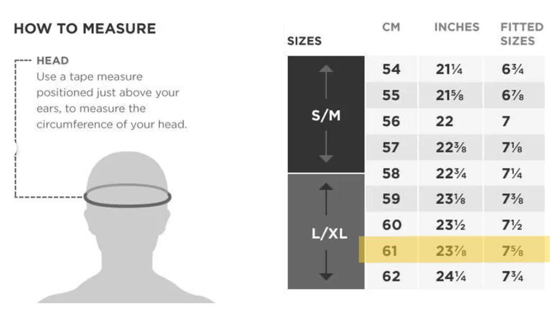 Size 7 5/8 corresponds to a head circumference of approximately 24 inches (61 cm).